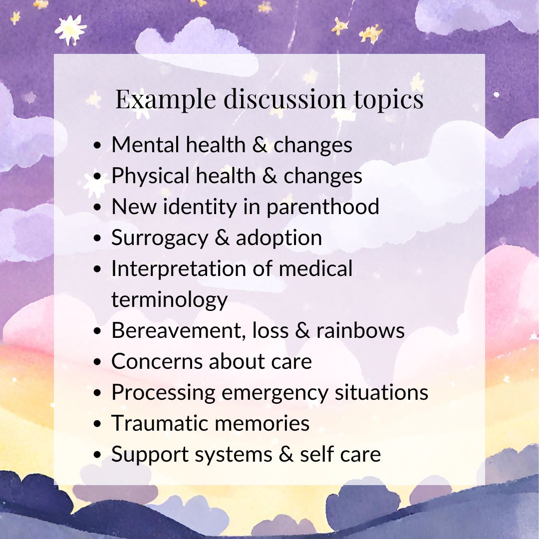 Many parents are left with residual questions, thoughts and concerns about their experience. Whether it's chatting through events to gain perspective and understanding, processing the changes that parenthood brings, or simply having someone translate medical jargon into plain English, we're here for you.